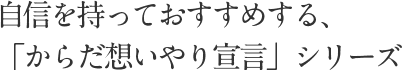みなさまの「からだ」のために何が必要か、改良を重ねてできあがったのが、弊社の「からだ想いやり宣言」シリーズです。みなさまに毎日続けてもらいたいから、素材の一つ一つ、中身と安心・安全にこだわりました。